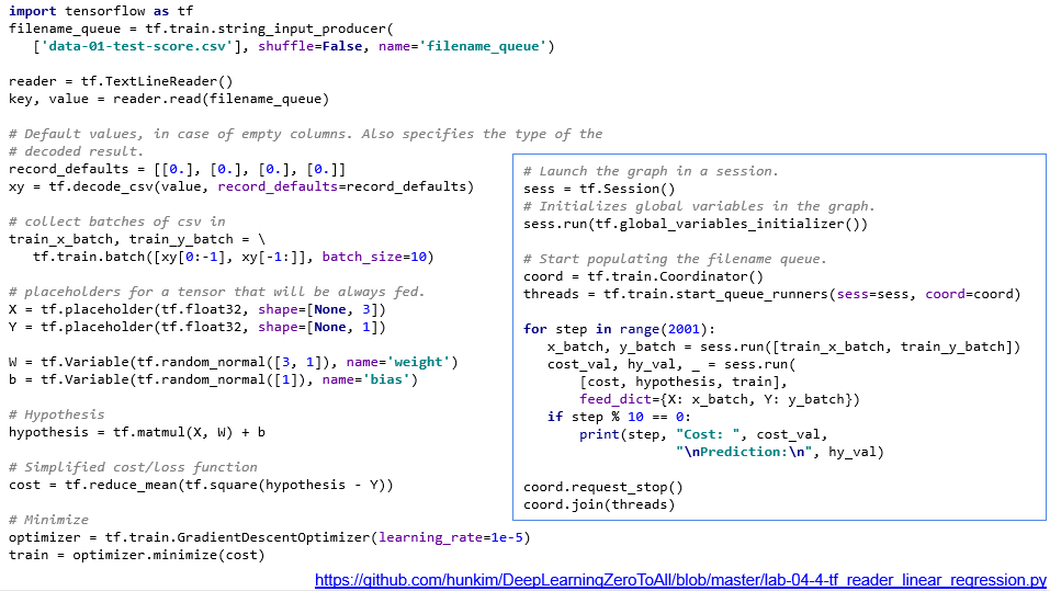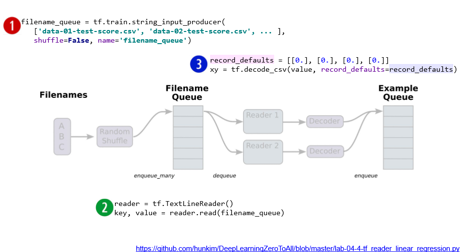 # 아래 함수를 이용해 QueueRunner와 쓰레드들을 한번에 생성해줌,